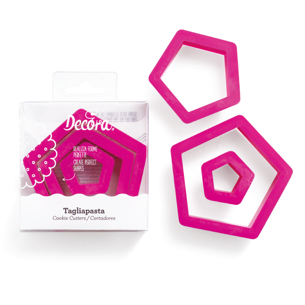 Το σετ κουπάτ Πεντάγωνα της Decora περιλαμβάνει 3 μεγέθη (1,5, 3,5, 5,0 εκ.) και δημιουργεί καθαρά και ομοιόμορφα πεντάγωνα σχέδια, ιδανικά για μπισκότα, cupcakes και τούρτες με γεωμετρικά ή μοντέρνα μοτίβα.