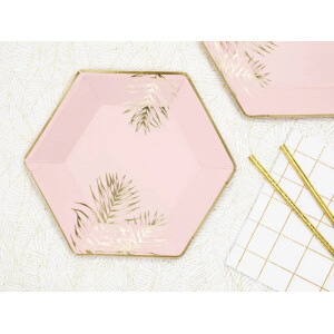 Πιάτα χάρτινα εξάγωνα ροζ με χρυσά φύλλα 23cm 6τεμ PartyDeco